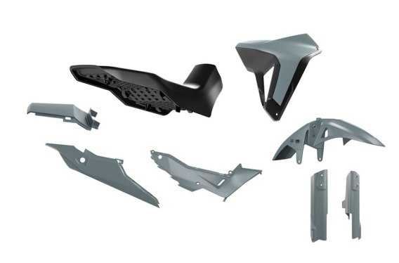 Zestaw zawiera przedni błotnik, tylny błotnik, osłony chłodnicy, boczki centralne, boczki tylne, osłony amortyzatorów oraz siedzenie